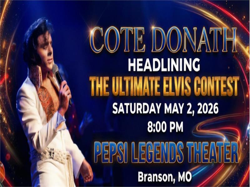 Experience the excitement of the Ultimate Elvis Festival as Cote Donath takes center stage at Pepsi Legends Theater in Branson, Missouri. Known for his commanding vocals, authentic style, and dynamic stage presence, Donath delivers a tribute that captures the spirit and energy of Elvis Presley at his peak. This headlining performance blends classic hits, Vegas flair, and unforgettable showmanship into one thrilling afternoon of entertainment. Join fans from around the country on Saturday, May 2, 2026 at 2:00 PM for a celebration of the King’s music in one of Branson’s premier theaters.