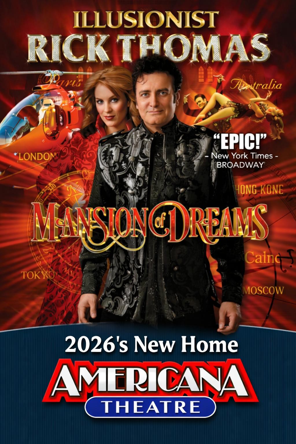 The internationally acclaimed, multi-award-winning illusionist Rick Thomas presents his crowning achievement, 'The Mansion of Dreams', right here in Branson! This is an amazing journey never to be forgotten, best described as EPIC!